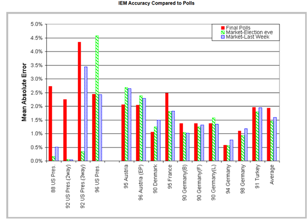 And thus, we have onto ourselves sophisticated information aggregation engines. In a perfect world the efficiency of prices as signals plus the power of decentralized knowledge ought to make these markets more accurate than traditional experts we have come to rely on.